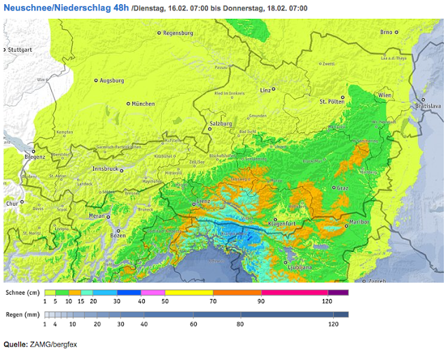 | 10 bis 20 cm, teilweise auch 30 cm Neuschnee (Karawanken, Julische Alpen) bringt das Tief VIRGINIE von den Karnischen Alpen bis zum Wechsel (Quelle: bergfex.at) |